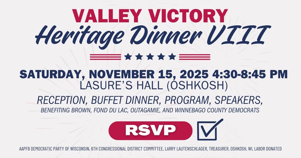Democratic Party of Outagamie County Office 516 W. College Ave, Appleton, WI, United StatesPLEASE NOTE THE EARLIER START TIME FOR THE NOVEMBER MEETING ONLY Join local Democrats at our monthly meeting to stay informed, share ideas, and get involved in events, campaigns, and community outreach. Open to all of those interested in supporting our work to move Wisconsin forward. Packer tailgate after. Bring a snack to share, if […]